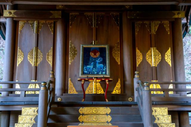 この度、東京在住の華玲子先生より絵画「神鹿」の御奉納をいただきました。早速「神鹿」の奉納奉告祭を執り行い、これより先、参拝される方々の心を癒やし和めていただける事と存じます。