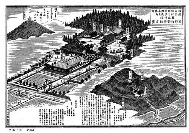 9月23日厳島神社祖霊社にて秋季祖霊祭を執り行いました。 たくさんの御参拝ありがとうございました。 当日は9時受付、10時祖霊祭、11時講演。講師は竹下茂木先生にお願い致しました。飯塚の色んなお話をしていただきました。 明治31年頃の厳島神社、宮司宅の銅板画です。今と様子が違ってますが当時がしのばれます。